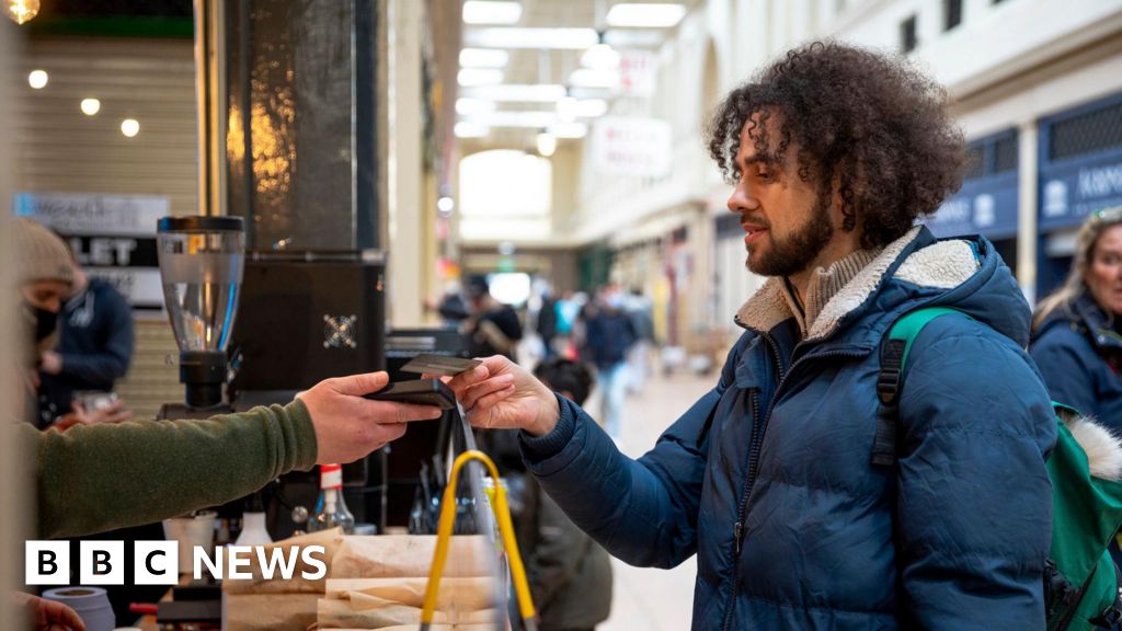 Getty Images A young man with curly hair and a blue puffer jacket paying for something at a coffee shop counter using his bank card Getty Images